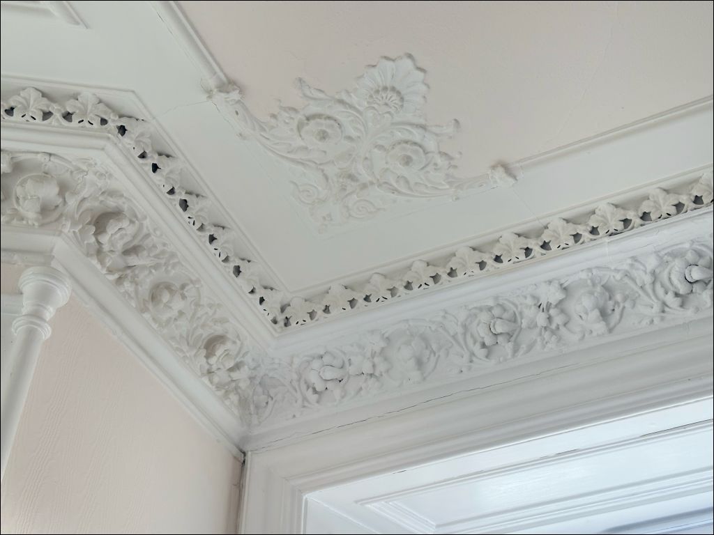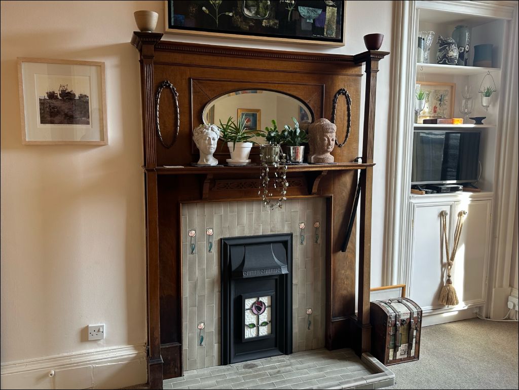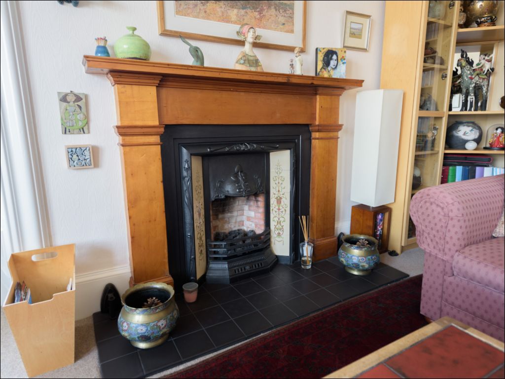 The accommodation opens via a welcoming entrance hallway with laminate flooring, leading to a bright and elegant upper landing. To the front, the impressive bay-windowed lounge is a standout feature — flooded with natural light and enjoying picturesque river views. The room is rich in period detail, including ornate cornicing, a feature fireplace with tiled hearth, and generous proportions ideal for both relaxing and entertaining.