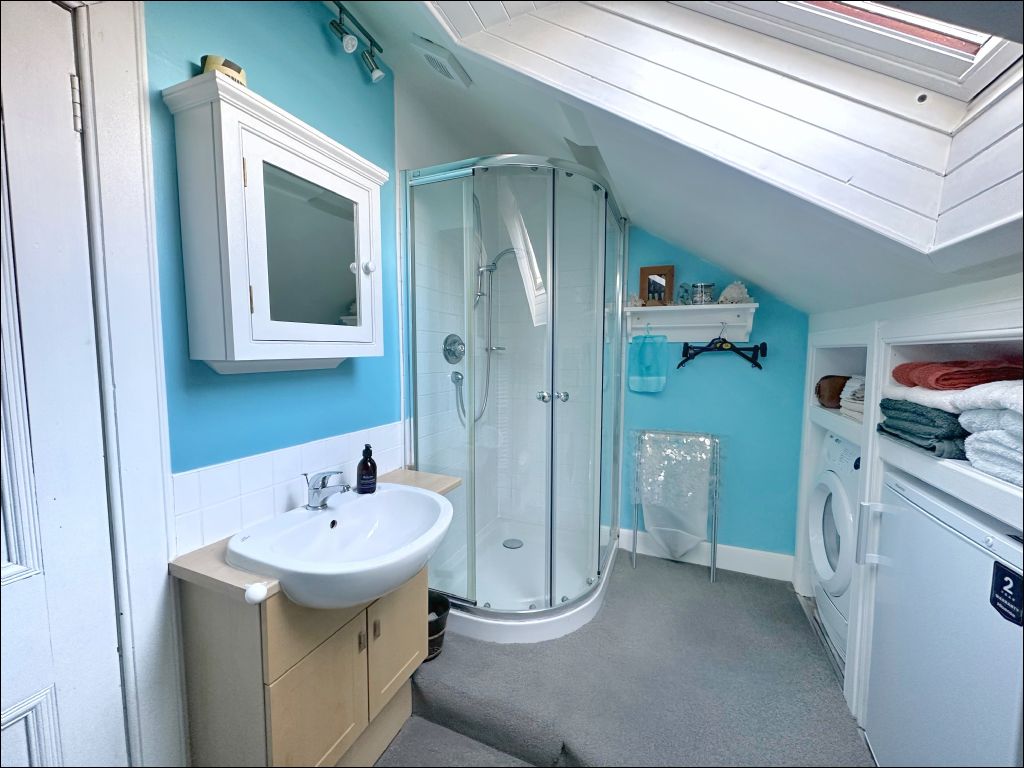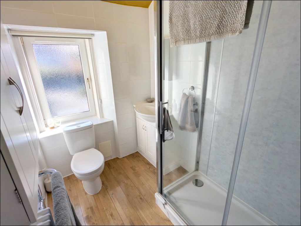 A modern shower room completes the first floor, fitted with a white suite, vanity storage, large shower enclosure and heated towel rail.