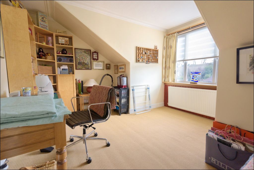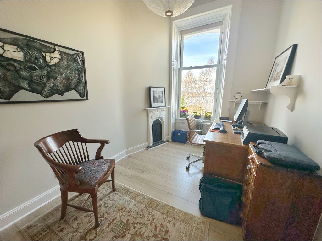 The principal bedroom is a particularly attractive room, featuring a decorative fireplace, detailed cornicing and a peaceful rear outlook over the garden. A further versatile room on this level, currently used as a home office, benefits from a large front-facing window and similar period detailing.