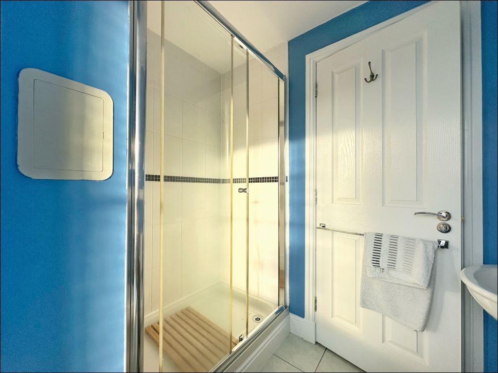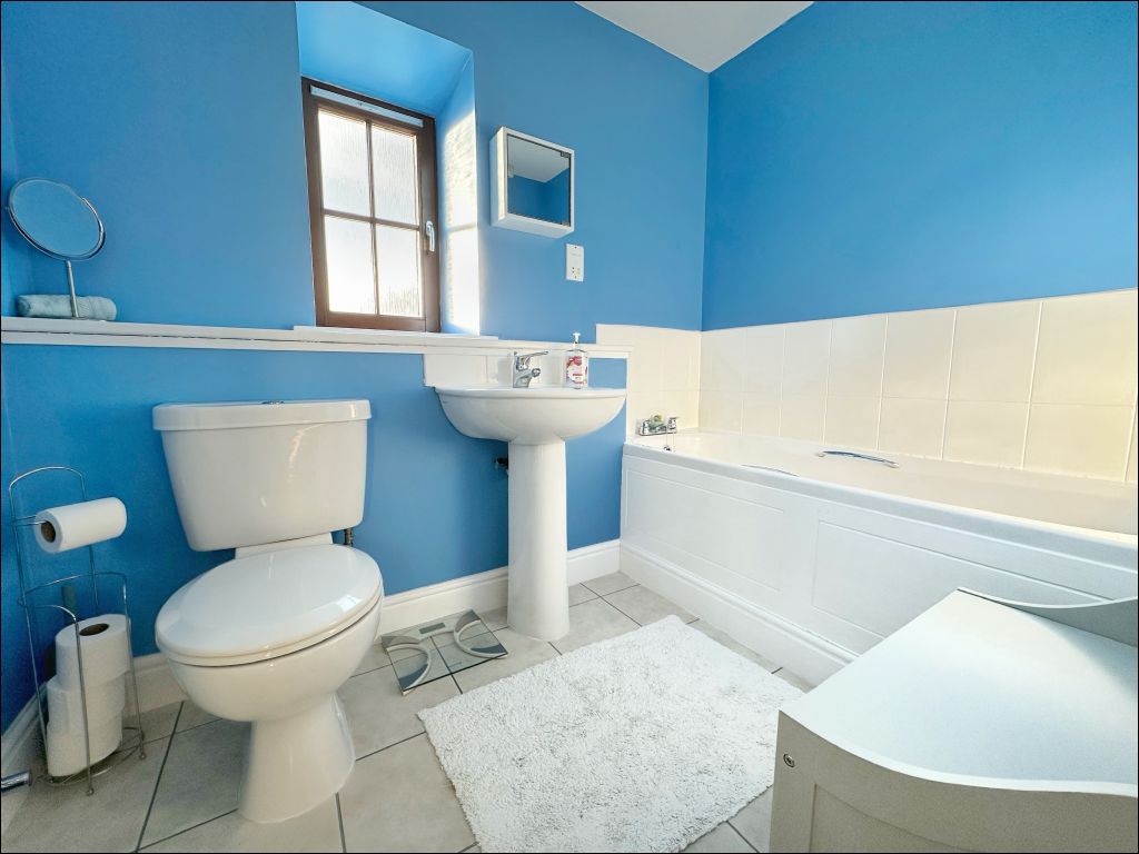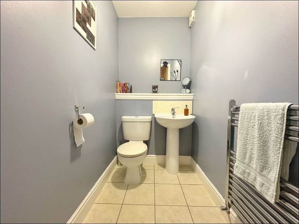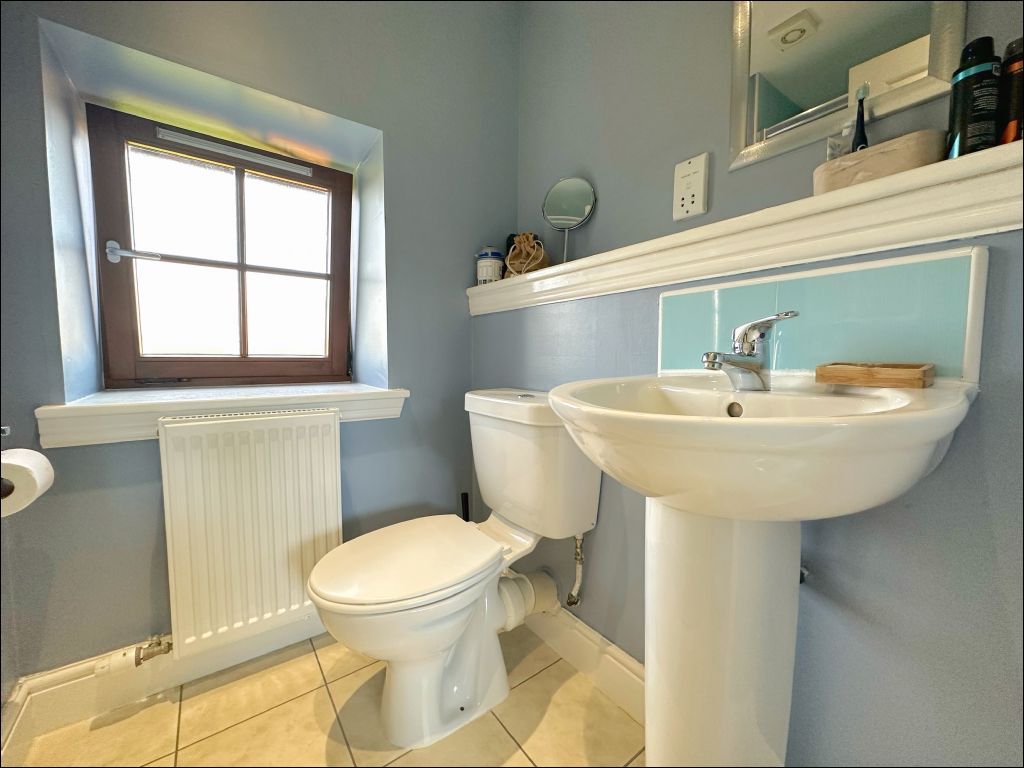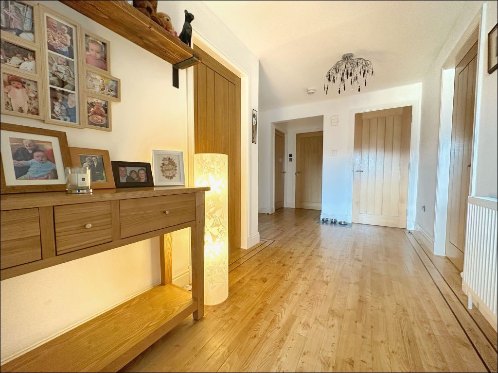 The carpeted staircase leads to the first-floor landing which is excellently sized offering an office space. The two larger bedrooms both benefit from fitted wardrobes and an en-suite each. Both en-suites have Karndean tile effect flooring, wash hand basin, w.c. and shower cubicle. The two further bedrooms are also of a good size and include fitted wardrobes. The family bathroom is located to the front of the property and is fitted with a three white suite and heated towel rail.