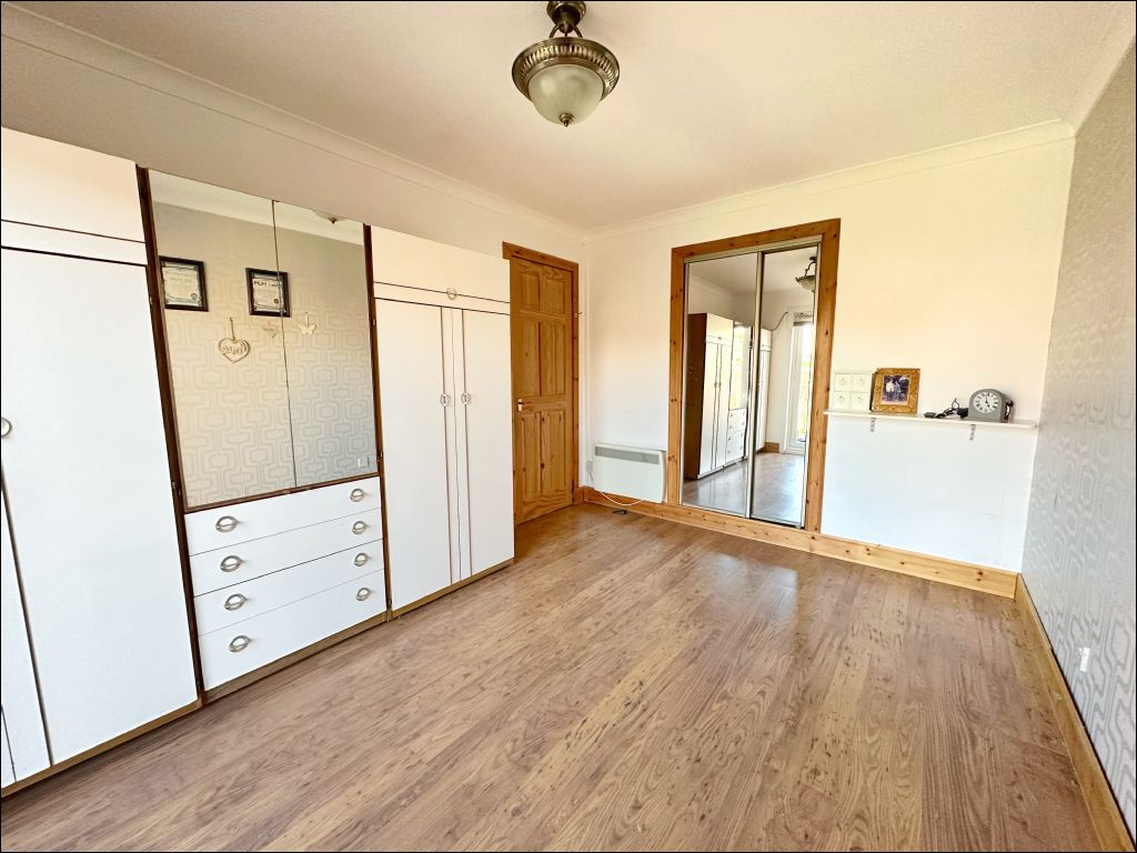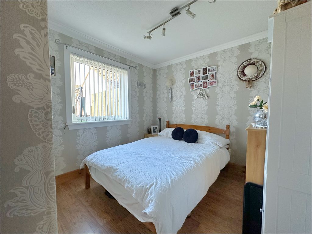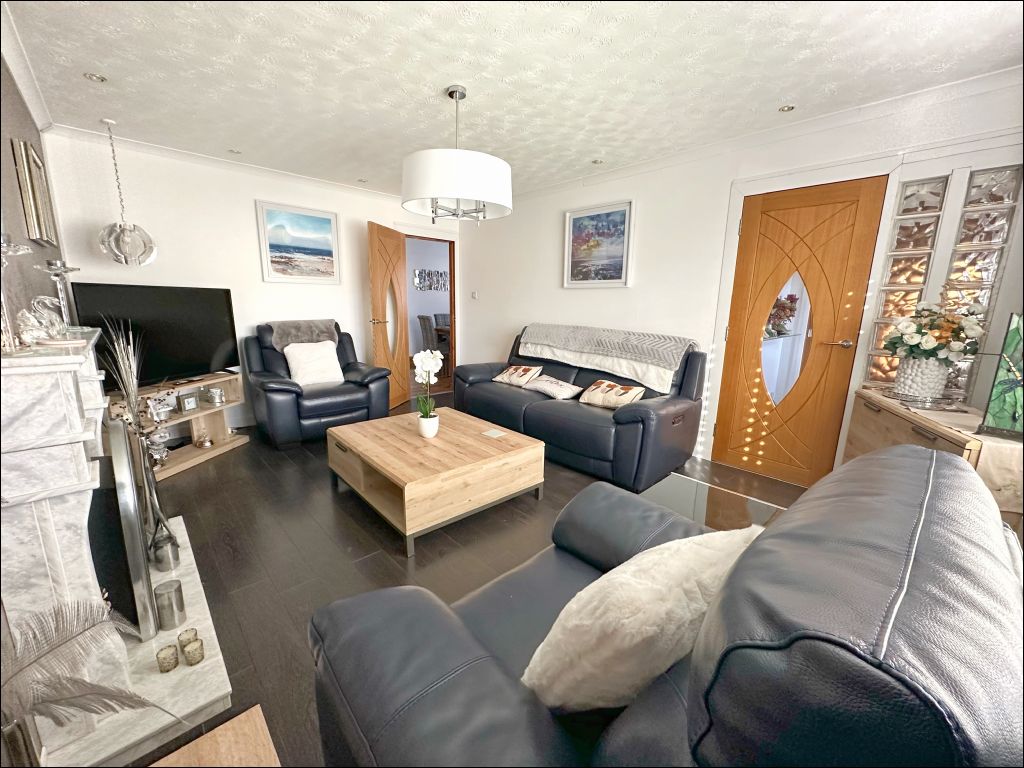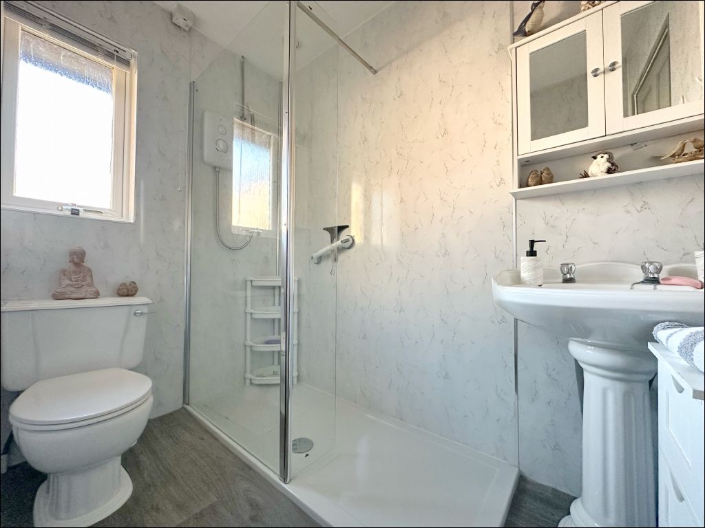 The three bedrooms are accessed from the hallway which is laid with laminate flooring and includes a linen cupboard. The main bedroom benefits from fitted wardrobes with mirror sliding doors and patio doors opening to the rear garden. The second bedroom is also laid with laminate flooring and includes a mirrored wardrobe ideal for storage. The third bedroom offers versatile use either as a guest room or office space. This room also includes a storage cupboard and window with fitted blinds. The shower room is of a modern design with a large walk-in shower cubicle, white wash handbasin and matching W.C. The room is finished with wood effect linoleum flooring and a white marble effect wet wall ideal for easy maintenance.