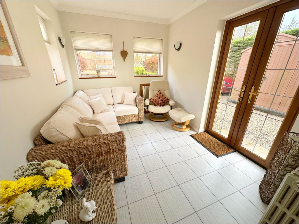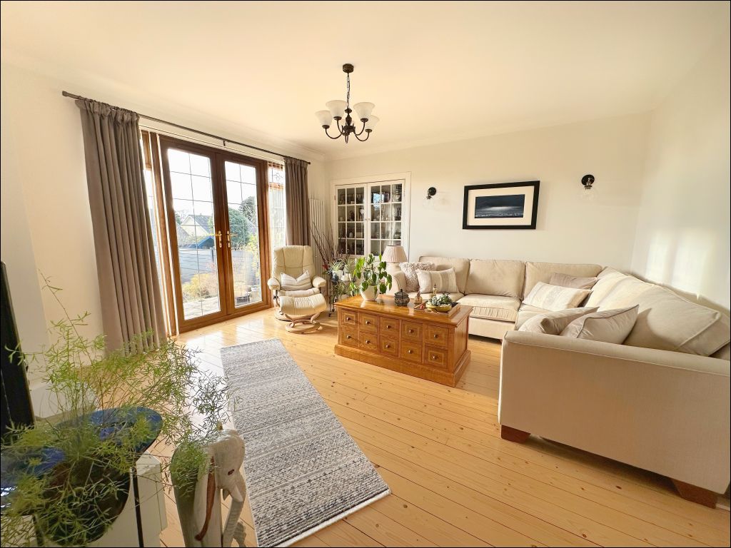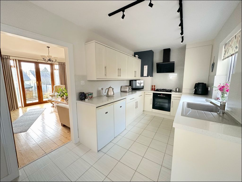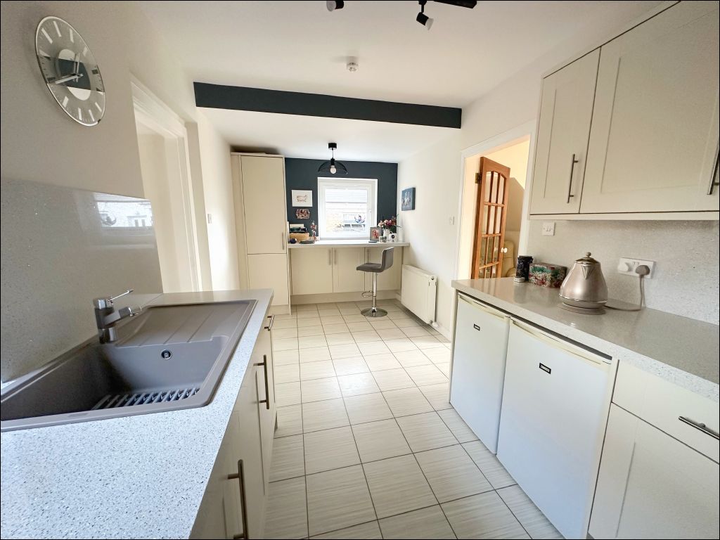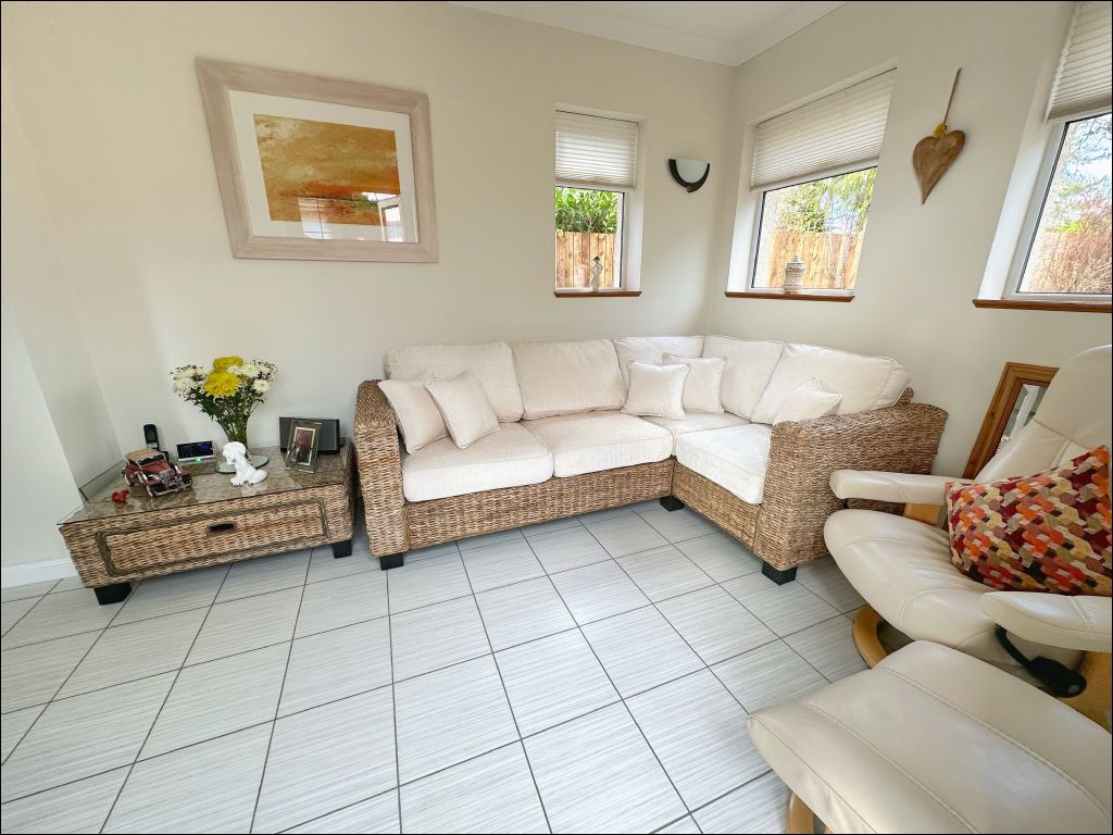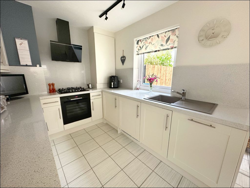 The property opens to the entrance hallway with stairs leading to the first floor accommodation. Accessed from the hallway is the bright and spacious lounge which is located to the rear of the property benefiting from ample natural light through the south facing patio doors. The room is laid with wood flooring which is an excellent feature to this room along with the display cabinet with Georgian doors. To the front of the property is the modern fitted kitchen and garden room. The kitchen benefits from cream wall and base units with a white and sparkle effect worktop and splashback. The integrated appliances include an oven, extractor hood, gas hob, dishwasher, tumble dryer and washing machine. The undercounter fridge and freezer are also included in the sale. The kitchen also benefits from a breakfast bar with additional storage underneath and window providing views to the side of the property. The garden room is an excellent additional sitting room with a welcoming atmosphere and patio doors opening to the front garden.