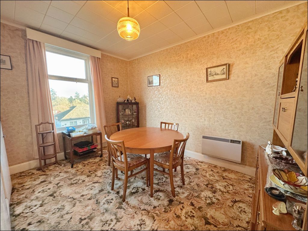 The main bedroom is fitted with carpet flooring and includes overhead storage cupboards and wall mounted lights. The two further bedrooms are of a similar size with the third bedroom currently being used as a dining room. The bathroom is fitted with a three piece cream suite and features attractive wood panelling along with a matching vanity unit.