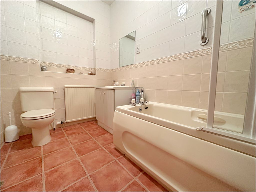 The main bedroom benefits from a south facing bay window with views towards the River Tay through the trees. The en-suite is fitted with a vanity unit and bulkhead with large mirror brightening the room. This room also includes a shower cubicle with tiled surround. The two further double bedrooms are both fitted with carpet flooring with the larger benefiting from a fitted triple wardrobe. The family room offers a more intimate retreat with floor to ceiling windows and patio doors opening to the rear garden. The family bathroom is generously sized with tiled effect flooring and tiled walls. The room is fitted with a three piece suite and an electric shower over the bath.